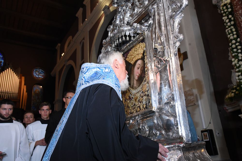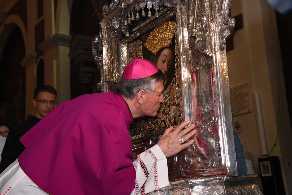 Poslije kardinalova blagoslova po ustaljenom običaju podijeljeni je blagoslov s Gospinom slikom. Nakon blagoslova uputila se procesija prema crkvi. Prije negoli je Gospin lik postavljen na oltar otac Kardinal ga je pokadio, zatim su ga prisutni biskupi i svećenici poljubili. Nakon što je postavljena slika na oltar Kardinal i svi prisutni svećenici obašli su oko Gospinog oltara dok je narod jednoglasno pjevao u čast Gospe Sinjske Zdravo Majko Milosti.