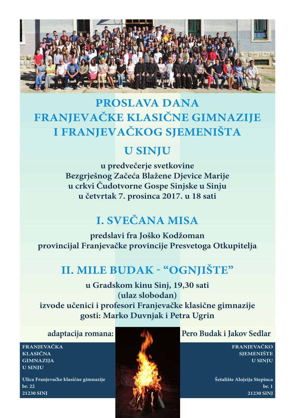 Uoči svetkovine Bezgrješnog začeća BDM-e, Franjevačka klasična gimanzija i Franjevačko sjemenište u Sinju proslavili su svoj dan. U četvrtak, 7. prosinca 2017., u crkvi Gospe Sinjske euharistijskim slavljem za učenike Gimazije i Sjemeništa, njihove roditelje te djelatnike predsjedao je fra Joško Kodžoman, provincijal Provincije Presvetog Otkupitelja. Misa je započela u 18 sati. Koncelebrirali su profesori te fratri iz samostana i samostanskog okružja, a đakonirali su fra Dejan Međugorac i fra Ante Prološčić. Liturgijskim pjevanjem animirao je gimnazijski mješoviti zbor.