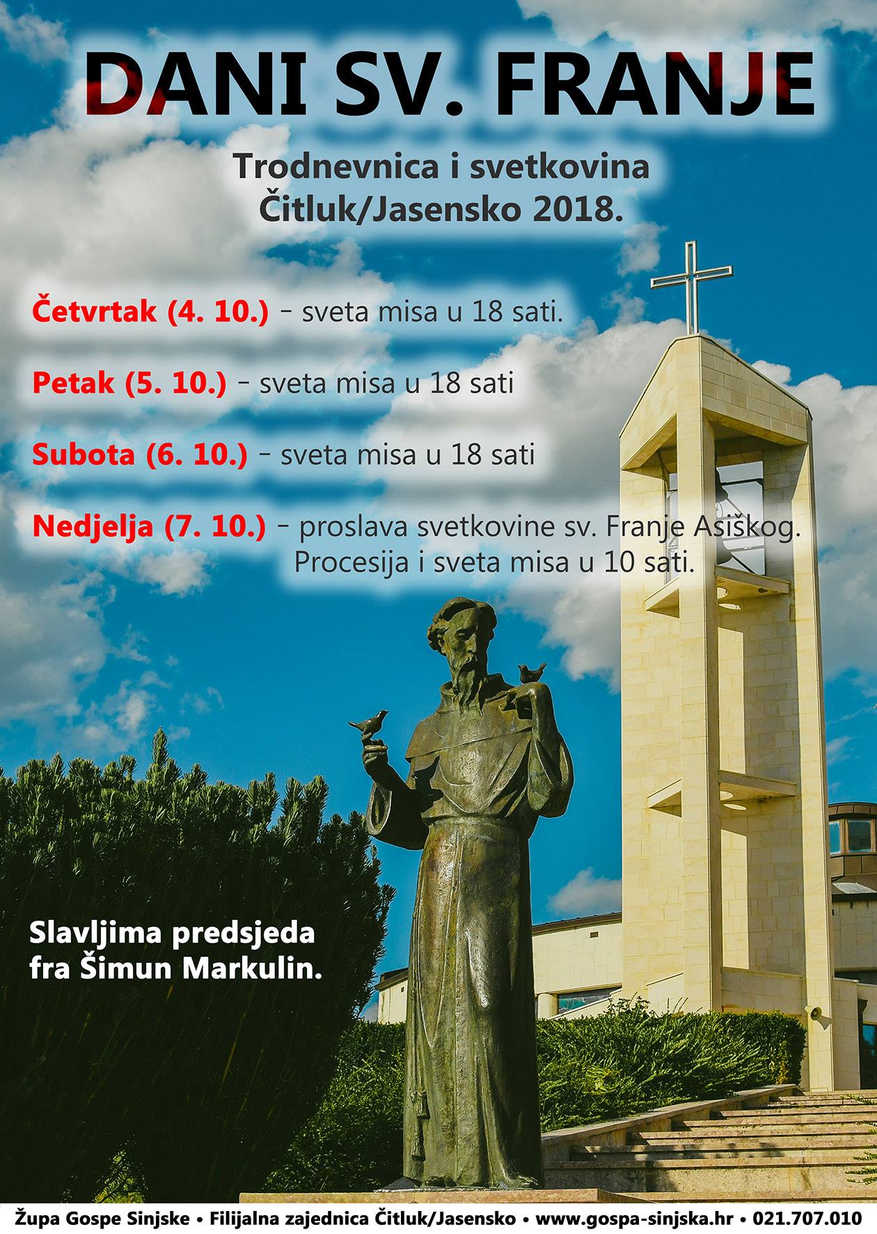 U nedjelju, 7. listopada 2018., zajednica vjernika u Čitluku i Jasenskom proslavila je svetkovinu sv. Franje Asiškog, naslovnika mjesne crkve i zaštitnika tih dviju zajednica u sastavu Župe Gospe Sinjske. Euharistijskim slavljem u 10 sati predsjedao je fra Šimun Markulin, a koncelebrirala su trojica svećenika: fra Perica Maslać, župnik, te fra Ante Grčić i fra Stipe Matić, koji i sami potječu iz zajednice koja danas broj 265 obitelji. Uoči svetkovine održana je trodnevna priprava s početkom u 18 sati, a fra Šimun je predsjedao i misnim slavljima koja su prethodila središnjoj proslavi. Tijekom trodnevnice okupljeni vjernici promišljali su o važnim trenutcima iz života asiškog Siromaška, počevši od njemu toliko dragog pozdrava „Mir i dobro“, kojim je blagoslivljao braću i sav svijet. Drugoga dana čuli su govoriti o Franji đakonu, koji se spremno i bezuvjetno stavljao na službu drugima, a zadnjega dana priprave fra Šimun je propovijedao o Franjevačkom redu, konkretnom obliku života u poslušnosti, bez vlasništva i u čistoći. Toga dana vjernici su imali mogućnost slaviti sakrament svete ispovijedi, a ispovijedala su trojica svećenika.
